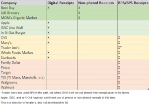 - Only one-third of retailers have adopted digital options, and the vast majority of retailers issuing paper-based receipts continue to use papers with BPA or BPS coatings. Among the leaders identified in the report as having moved away from BPA/BPS receipts are Apple, Best Buy, GNC Live Well and Lidl Grocery. Laggards cited in the report as still using traditional paper receipts are Family Dollar, Petco, Target, TJ Maxx/Marshalls, Walgreens and Walmart. The report also finds that several companies, including CVS and Whole Foods offer digital receipts, but primarily give customers BPA or BPS receipts.