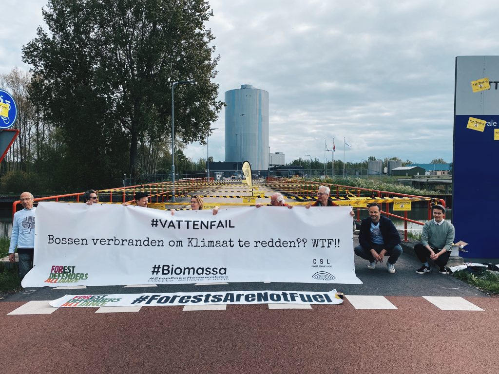 In Diemen, activists under the flag of Comite Schone Lucht are occupying the bridge for Vattenfall with yellow tapes with the text: “Crime Scene, do not enter”, with a 10 metre long banner saying: “Forests burn to save the Climate? WTF!” Fenna Swart of the Clean Air Committee said: “Last Friday, the Dutch cabinet decided to stop all new biomass subsidies immediately. Vattenfall has always referred to politics in critical questions. Now that it has spoken so explicitly, Vattenfall should keep its word. It’s clear: there is no longer any support for biomass, neither in politics nor in the municipalities or society. Continuation definitely means the end of Vattenfall’s credibility when it comes to their intentions regarding sustainability.”