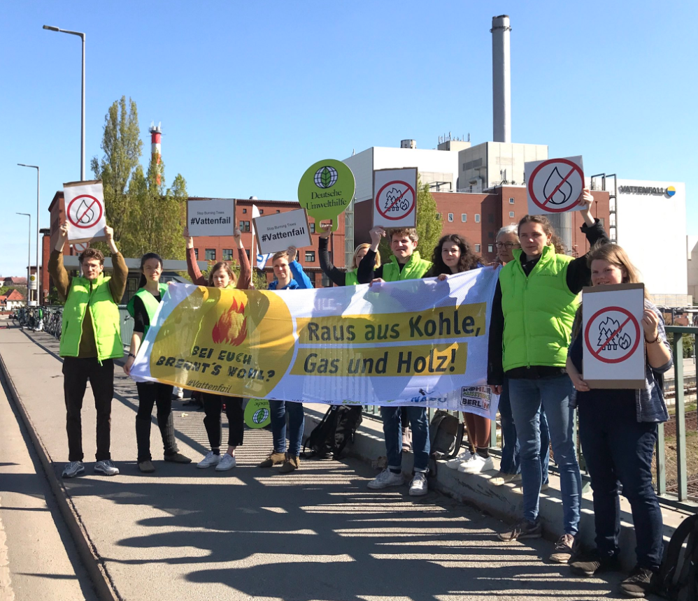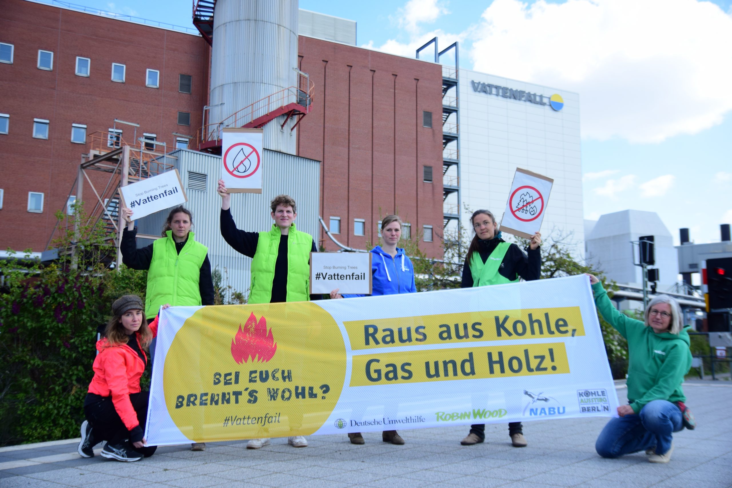 In Berlin, climate and environmental groups including Deutsche Umwelthilfe (DUH), Naturschutzbund (NABU), Naturfreunde Deutschlands and ROBIN WOOD rallied in front of Vattenfalls powerplant Moabit. In Moabit Vattenfall is burning coal as well as wood biomass– planning to expand the latter considerably. In other power plants in Berlin, Vattenfall is preparing to replace coal with fossil gas.