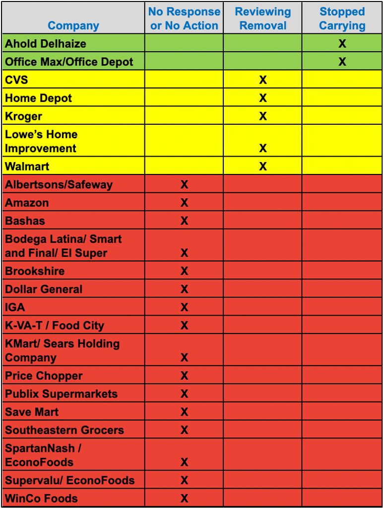 We applaud the companies who have shown leadership and have chosen to remove these socially and environmentally risky products from their shelves and online stores in order to offer more responsibly sourced options. Supermarkets and retailers who have not taken action should promptly review the information provided and assess the risk of carrying these products and their impact on Environmental, Social and Governance concerns. We encourage companies to contact us if they have additional information to update the chart. The chart will be periodically updated, dated and shared with our members and the public in the coming year.