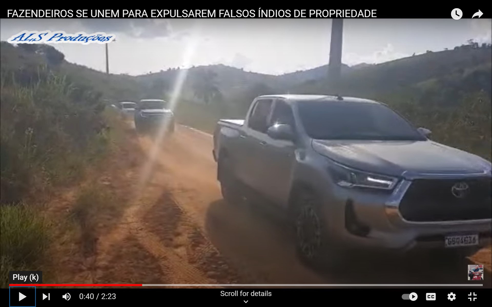 NB: in this Youtube video, the agrarian lobby refers to the Indigenous people who claimed back their land as “false indians” in an attempt to undermine their right to claim back the ancestral land. Extract: “The farmers of Southern Bahia, all the rural landowners, are getting together to remove the ‘false Indians’ from Fazenda Brasília. We are bringing everyone together to do what they are doing in Mato Grosso do Sul. From now on it’s going to be like this: if you invade a property, everybody is going to jump on you”.