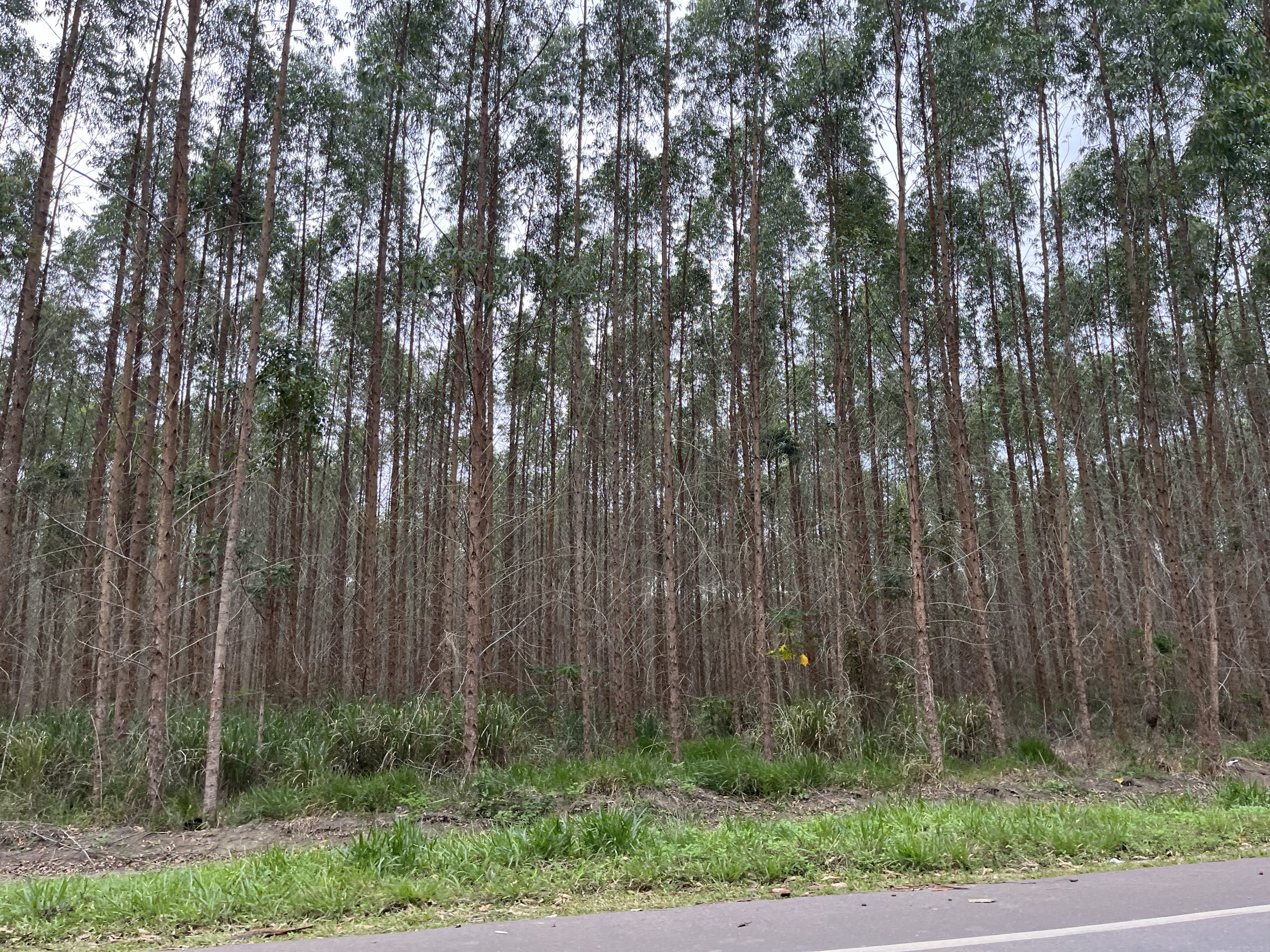 The road stretches on for miles, hemmed in by two dense walls of sickly-looking trees. Endlessly. These are the eucalyptus plantations that blanket the entire municipality of Conceição da Barra. three quarter of all agricultural land belongs to a single company: Suzano. 53,000 hectares of plantations in that municipality alone. Ironic signs urge respect for nature, right here where over forest have been converted into fast-growing industrial plantations, despite local legislation prohibits a concentration of more than 20% of agricultural land.